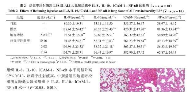 热毒宁注射液是由青蒿、金银花、栀子组成的现代中药制剂,具有清热、解毒、疏风功效。热毒宁注射液能够降低 ALI 模型大鼠肺脏 IL-1β、TNF-α、IL-4、IL-6、IL-8、IL-10、ICAM-1、NF-κB 等 LPS 致 ALI 过程中炎性介质的生成和释放,这可能是治疗 ALI 的重要机制[9]。